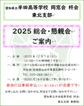- 2025年09月25日柊会 東北支部「2025年度 総会・懇親会」 開催のご案内